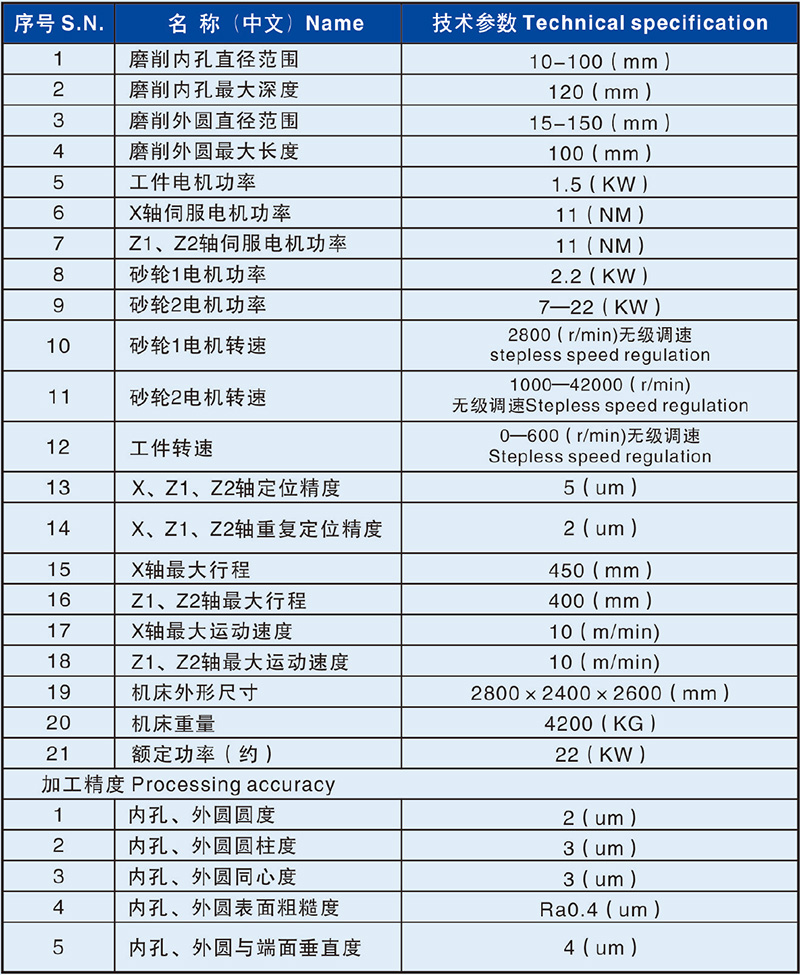 ●本機床爲三軸(X進給、Z1砂輪、Z2砂輪軸)二聯動數控複合磨床,主要用于磨削工件的内圓孔、内錐孔、台階孔🔞、内端😈面、外圓、外🛀🏼端面👻。磨削循環均自動完成(具有自動進刀、退刀、粗磨、精磨;自動修正砂輪、自動補償等功能)。