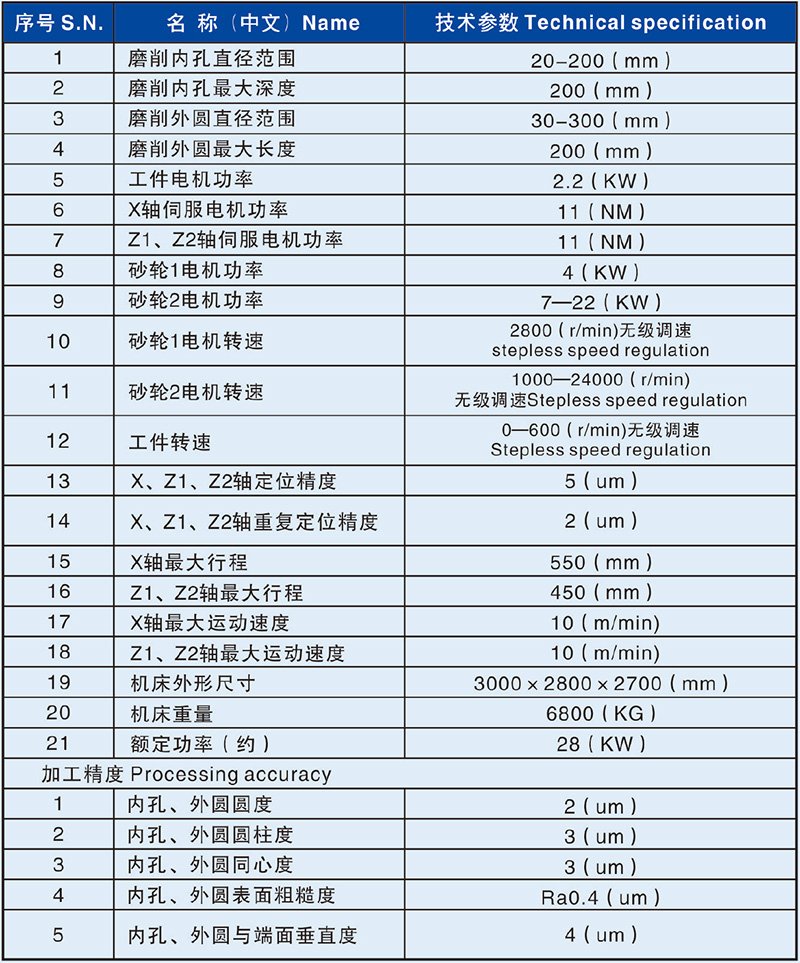 ●本機床爲三軸(X進給、Z1砂輪、Z2砂輪軸)二聯動數控複合磨👩🏿❤️💋👨🏽床🏃🏻♀️,主要用…于磨削工件的内圓孔、内錐孔、台階孔、内端面、外圓、外端面。磨削😵💫循環均自動完成(具有自動進刀、退刀、粗磨、精磨🛌🏻;自動修正砂輪、自動補償等功能)。